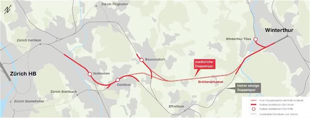 Il fulcro della nuova tratta è la galleria di Brütten, lunga circa 9 km, a doppia canna, con 20 bypass, con i suoi due raccordi da Bassersdorf e Dietlikon. Ogni canna sarà larga 10 m e a binario unico. Il portale nord della galleria si trova a Tössmühle, vicino a Winterthur. Contribuiranno inoltre all’aumento della capacità diramazioni senza intersezioni a Wallisellen, Dietlikon e Winterthur. I treni viaggeranno attraverso la galleria a 160 km/h, con un tempo di percorrenza di circa tre minuti.