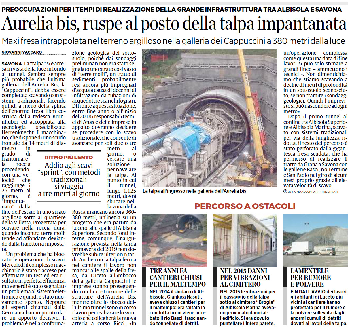 La TBM da 14 m di diametro utilizzata per lo scavo dell’Aurelia Bis, è ancora bloccata a circa 440 m dall’uscita della galleria Cappuccini. Da Agosto la TBM è ferma a Savona tra la chiesa dei ...
